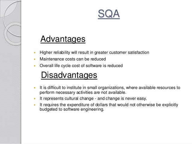 9 Benefits of software testing and quality assurance Most choices in life are made after considering the potential benefits involved. It is the set of activities which ensure processes procedures as well as standards are suitable for the project and implemented correctly. Software Quality Assurance SQA is simply a way to assure quality in the software.
