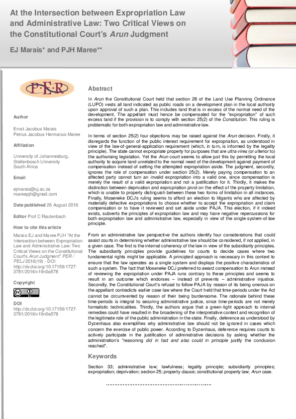 Pdf Ej Marais Pjh Maree At The Intersection Between Expropriation Law And Administrative Law Two Critical Views On The Constitutional Court S Arun Judgment 2016 19 Potchefstroom Electronic Law Journal 1 54