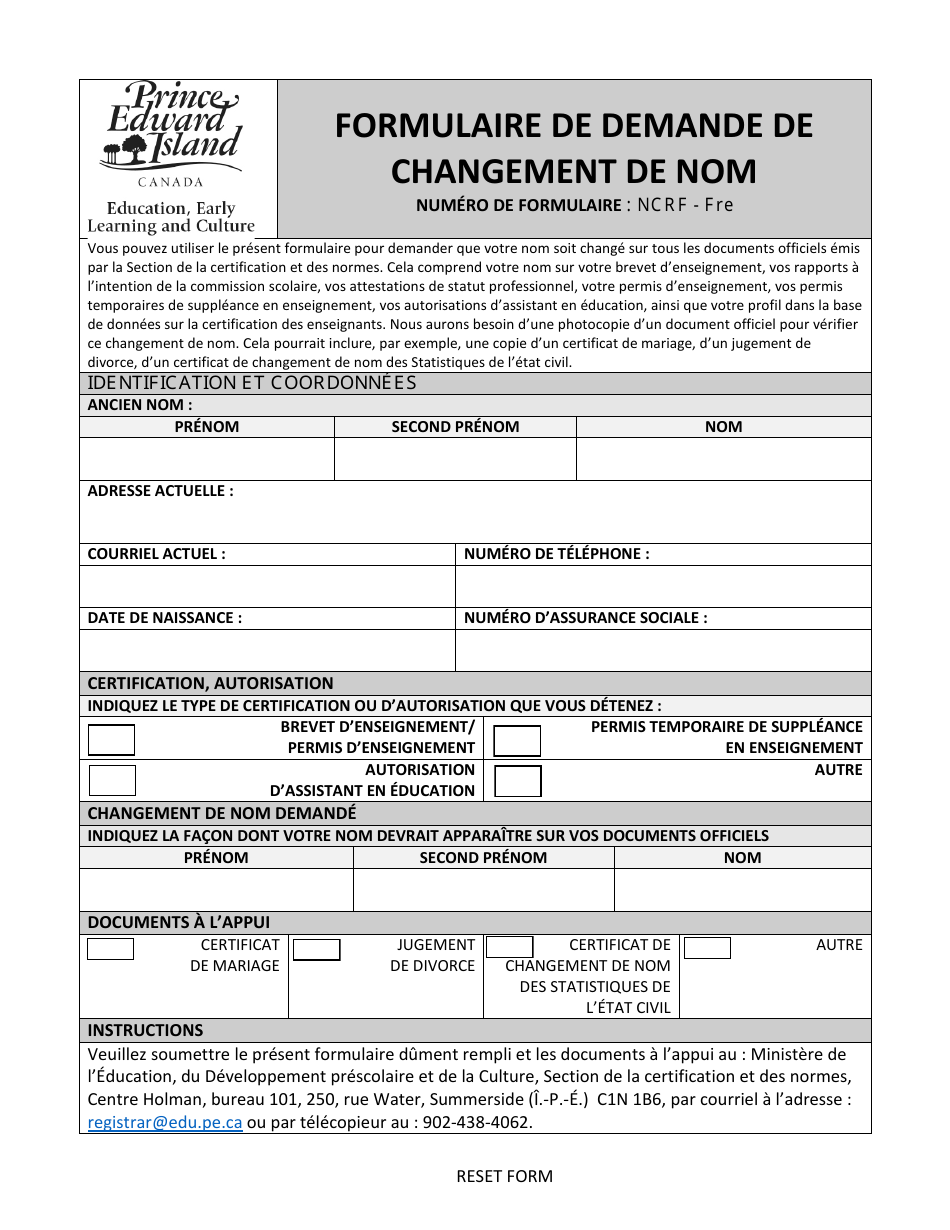 Forme Ncrf Fre Download Fillable Pdf Or Fill Online Formulaire De Demande De Changement De Nom Prince Edward Island Canada French Templateroller