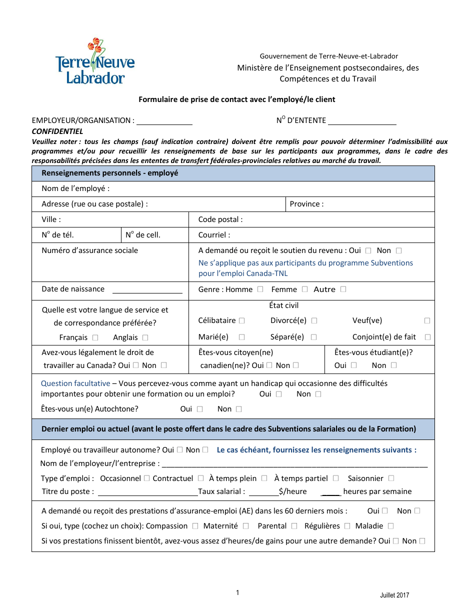 Newfoundland And Labrador Canada Formulaire De Prise De Contact Avec L Employe Le Client Download Printable Pdf Templateroller